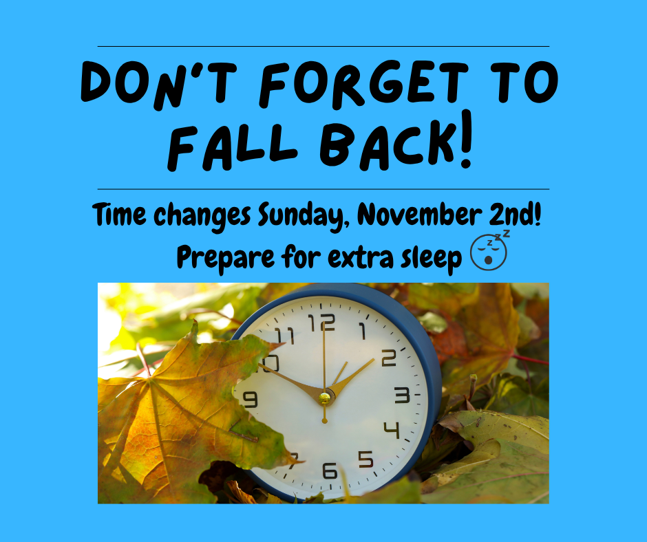 Daylight Saving Time ends this Sunday, November 2nd. Don't forget to set your clocks back one hour and enjoy a well-deserved extra hour of sleep!!